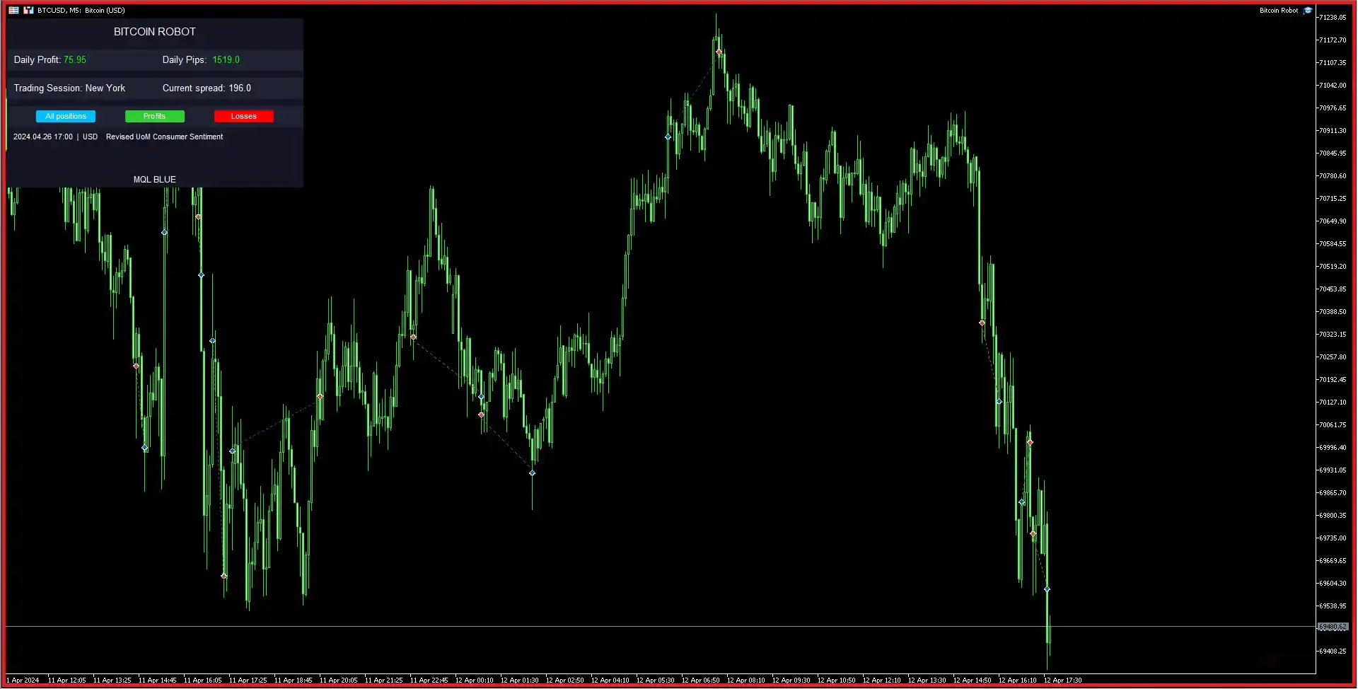 Broadly, the EA looks for trend confirmation on short timeframes (often M5) and uses protective stop loss and position sizing rules. It avoids aggressive multi-open techniques by default — that’s why it’s often promoted as a safer bitcoin EA option in marketplaces. Always treat claimed performance as user-provided/unverified.