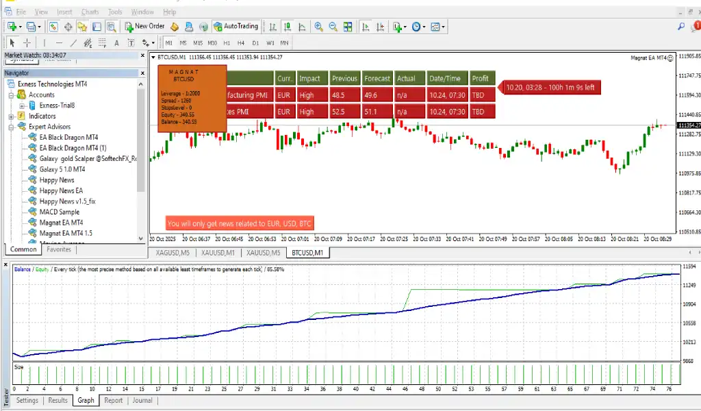 While many EAs fail in live market conditions, Magnat V1.5 has been optimized and tested to perform exceptionally well on stable and liquid currency pairs, primarily EURUSD and GBPUSD on the M15 and H1 timeframes.